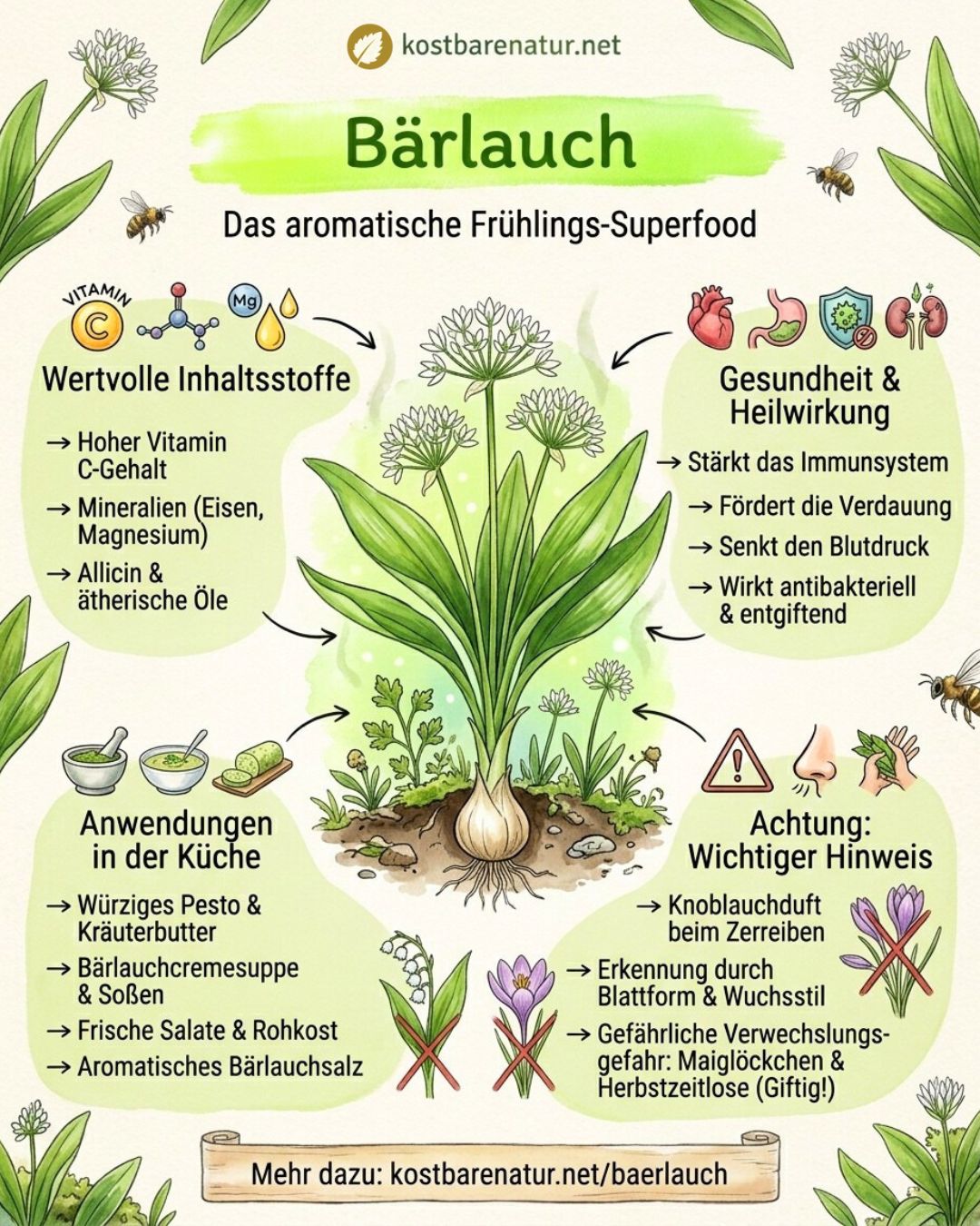 Bärlauch ist kulinarisch ein echter Schatz. Er verleiht Speisen eine aromatische, knoblauchähnliche Würze, ohne danach den typischen „Knoblauchgeruch“ zu hinterlassen. Genutzt werden vor allem die jungen Blätter, aber auch Blüten und Knospen sind essbar. Die Blätter enthalten Vitamin C, Eisen, Magnesium und wertvolle Schwefelverbindungen.2