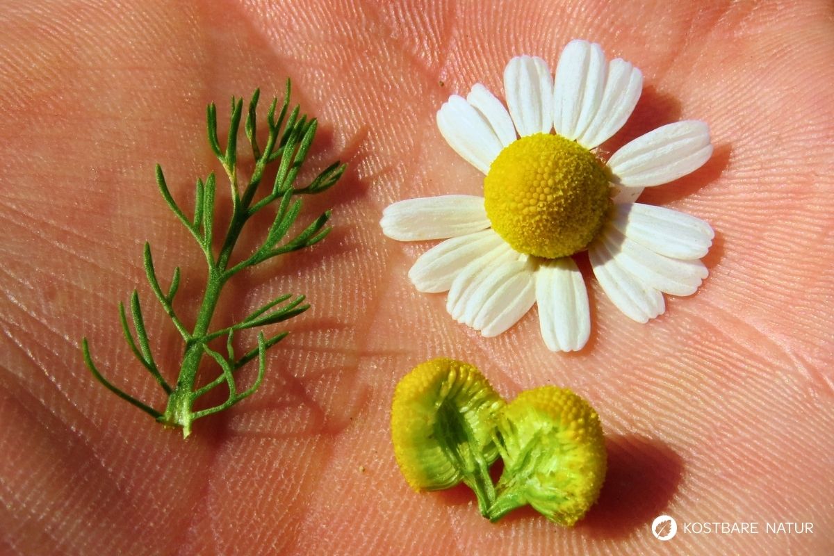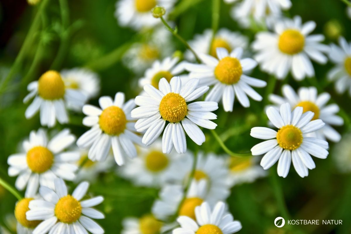 - Feldkamille, Mägdeblume, Mutterkraut, Apfelkraut, Kummerblume, Weiße Blume