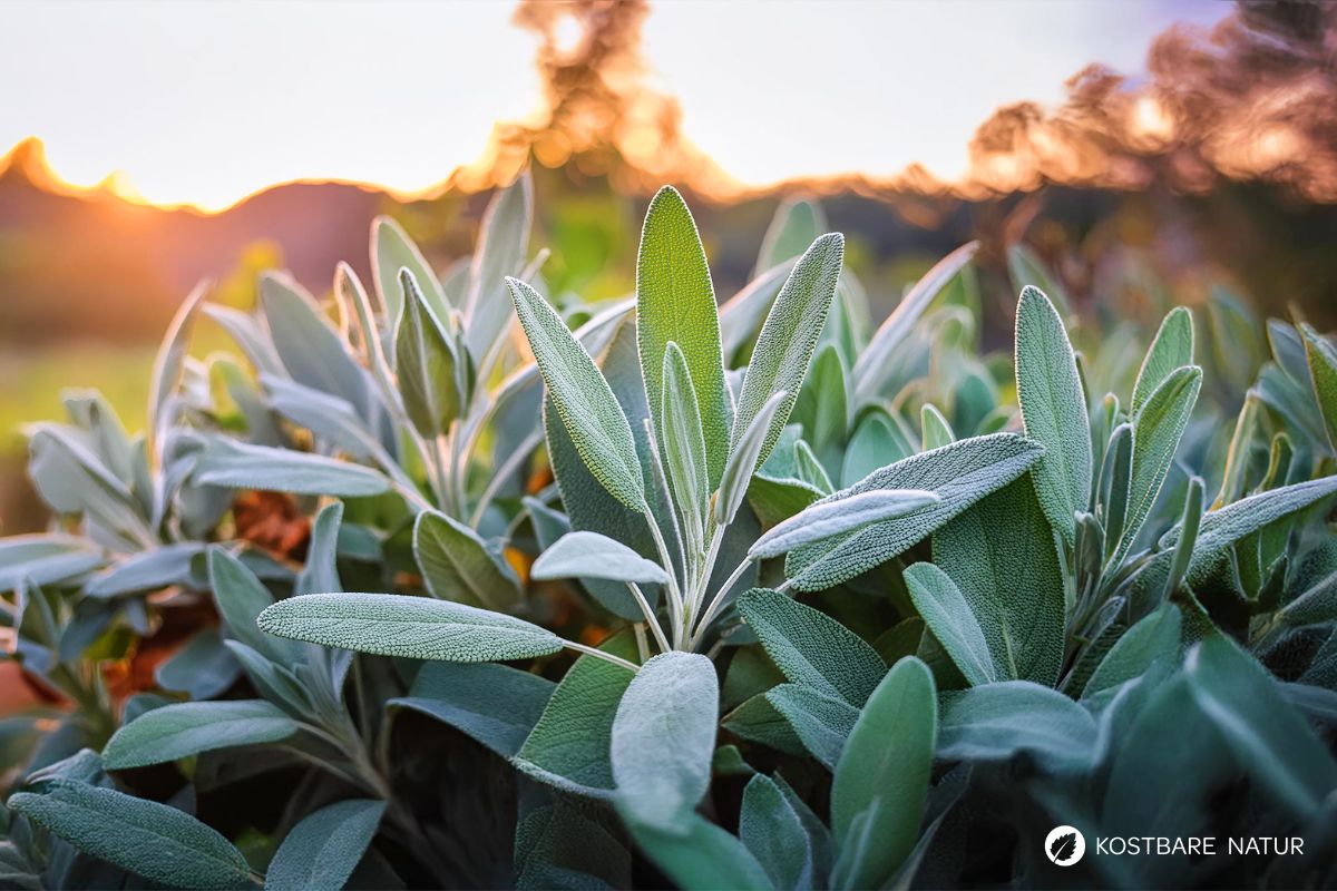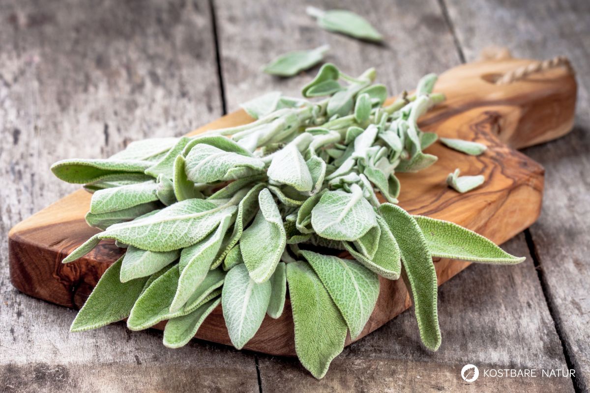 Verantwortlich für die Wirkung sind ätherische Öle wie Thujon und Cineol, Gerbstoffe, Flavonoide und Bitterstoffe. Diese Kombination macht Salbei antiseptisch, antibakteriell und zusammenziehend (adstringierend).8