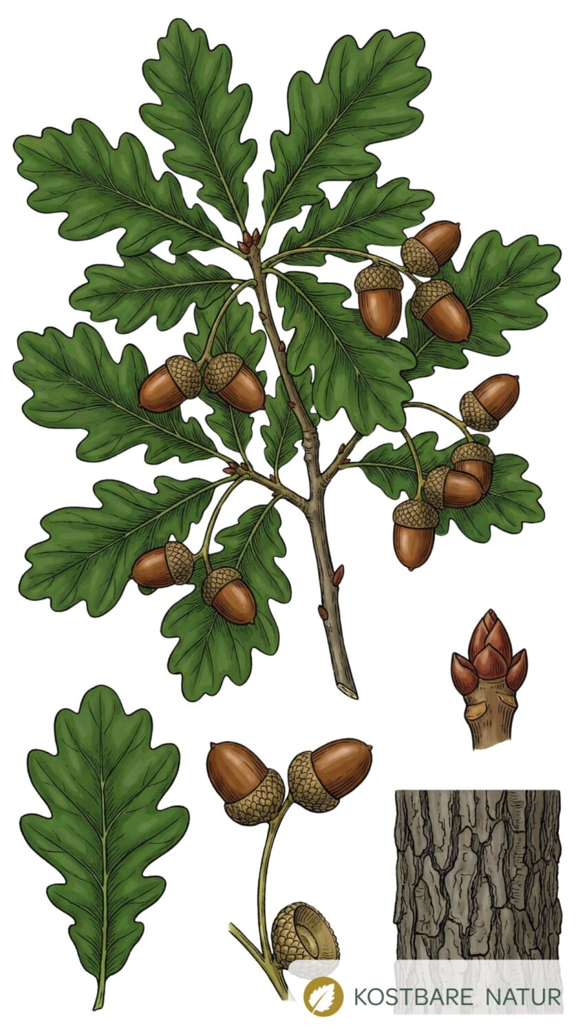 Die Rinde der Eiche besitzt aufgrund ihres hohen Gehalts an Gerbstoffen entzündungshemmende, antimikrobielle und juckreizlindernde Eigenschaften. Das Frühjahr bietet sich an, um Rinde zu ernten.