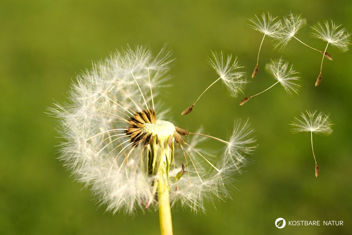 - Nach der Blüte entwickeln sich die bekannten Pusteblumen, die aus vielen kleinen, behaarten Samen bestehen, die jeweils an einem fedrigen Fallschirm hängen. Diese Samen werden vom Wind verbreitet und sind von Mai bis in den Herbst hinein zu finden.
