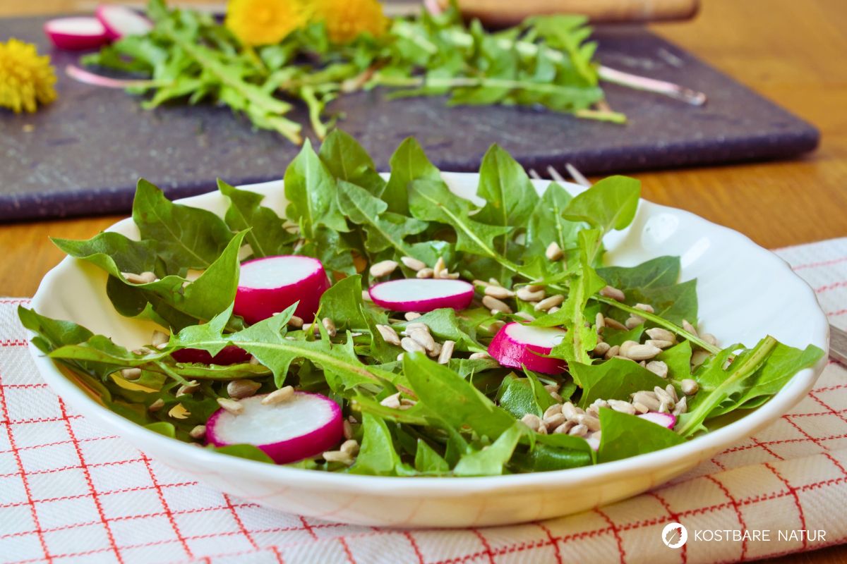 Die jungen Blätter des Löwenzahns enthalten weniger Bitterstoffe als ältere Blätter und sind daher besonders schmackhaft. Besonders im Frühjahr gibt es viele verschiedene Kombinationsmöglichkeiten für leckeren Löwenzahn-Salat.
