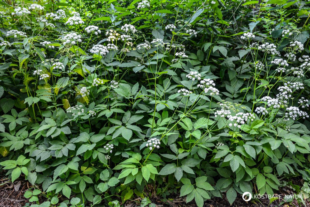 - Ausdauernde, krautige Pflanze mit dreigeteilten Blättern und weißen Doldenblüten
