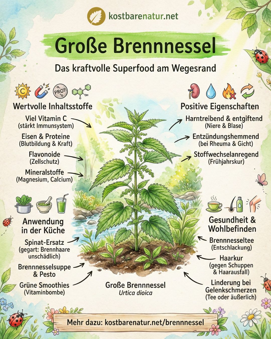 Die Große Brennnessel (Urtica dioica) gehört wohl zu den bekanntesten, aber auch am meisten unterschätzten Wildpflanzen. Sie wächst unscheinbar am Wegesrand. Doch steckt sie voller Kraft: Ihre Blätter und Wurzeln sind reich an Vitalstoffen und haben eine vielfach belegte Wirkung auf unsere Gesundheit. Traditionell wird sie zur Entgiftung, bei Gelenkbeschwerden, Hautproblemen und zur Stärkung von Haaren und Nieren eingesetzt. Auch in der Küche ist sie ein vielseitiges Wildgemüse, das Zuchtgemüse wie zum Beispiel Spinat in vielem übertrifft.