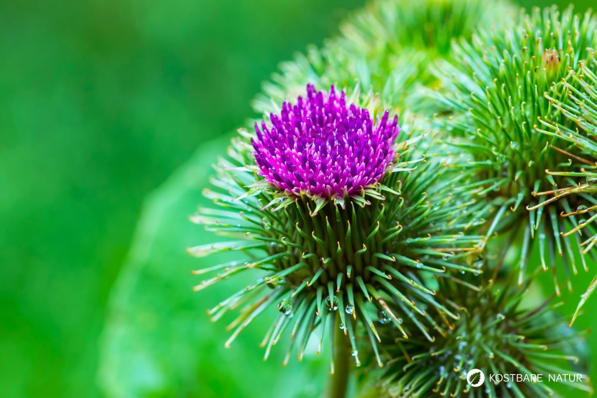 Die Große Klette (Arctium lappa) ist weit mehr als nur ein „klettenartiges“ Unkraut am Wegesrand. Seit Jahrhunderten schätzt man ihre Wurzeln, Blätter und Samen wegen ihrer vielfältigen Wirkungen auf Haut, Leber und Verdauung. Als Heilpflanze kommt sie besonders bei Hautproblemen, Stoffwechselstörungen und zur innerlichen Entgiftung zum Einsatz. Ihre Wurzel ist zudem ein wertvoller Bestandteil in der Küche und liefert Vitamine, Mineralstoffe und Bitterstoffe, die unseren Organismus anregen.