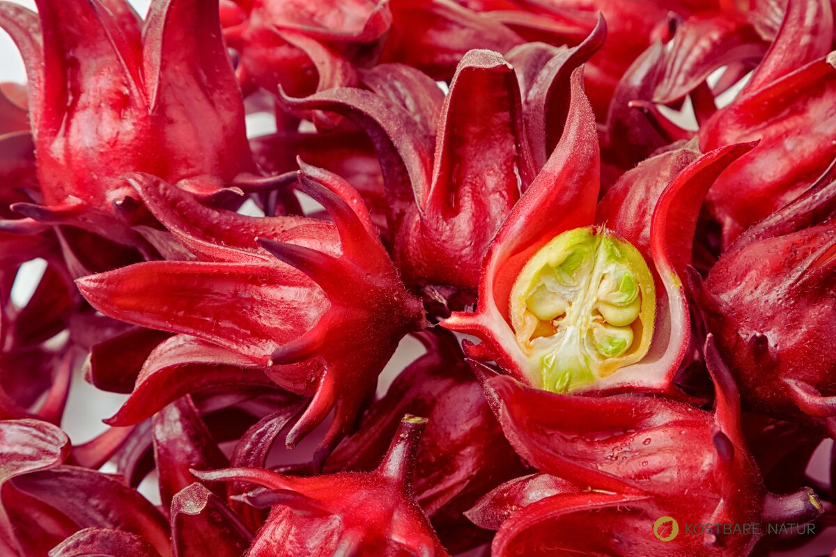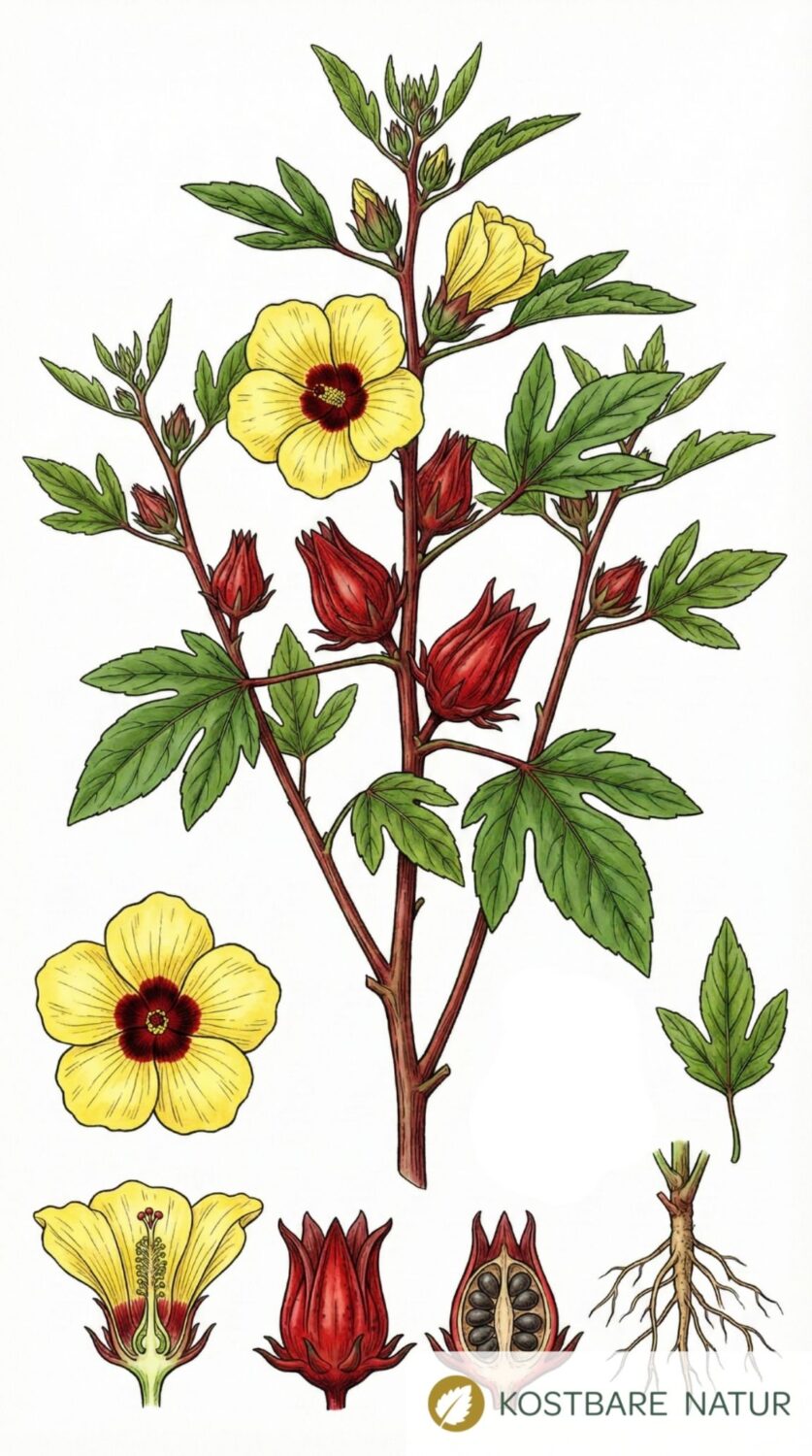 - Die Blüten sind fünfzählig, meist blass gelb oder sandfarben mit einem rot-dunklen Herz an der Basis der Blütenblätter. Besonders markant sind aber die fleischigen Kelchblätter: Sobald die Blüte abgefallen ist, entwickelt sich der Kelch weiter. Er wird fleischig-saftig und leuchtet rot. Diese roten Kelche sind das, was man für Tee, Getränke oder Lebensmittel nutzt.