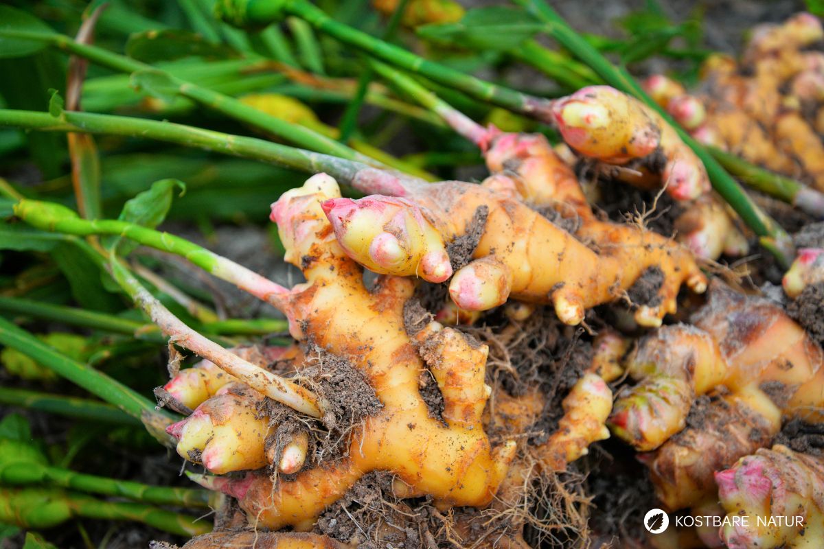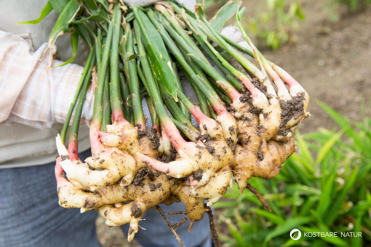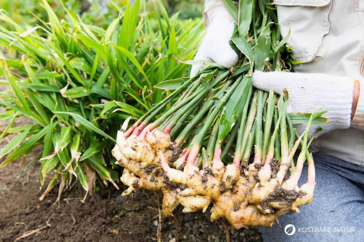 Nach ungefähr 10 Monaten ist es so weit: Deine erste Ingwer-Ernte kann kommen! Deine Pflanze ist nun mit 80 bis 120 Zentimetern groß und kräftig und du kannst die frischen Wurzeln ernten.
