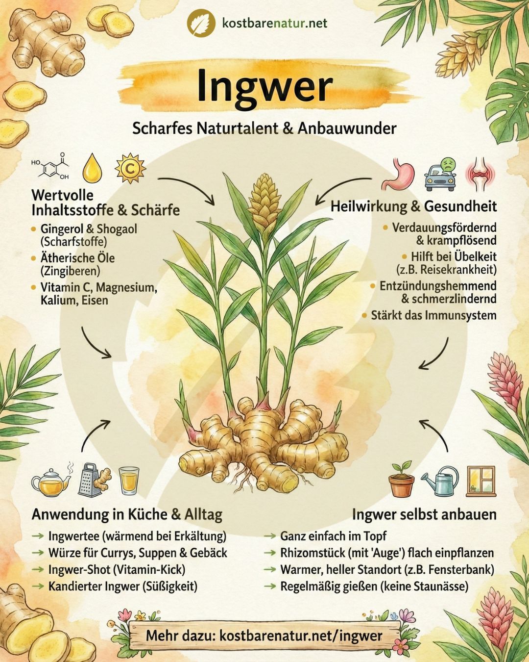 Ingwer (Zingiber officinale) ist viel mehr als nur ein exotisches Küchengewürz. Seit Jahrtausenden begleitet er den Menschen als Heilpflanze, Gewürz und Gesundheitshelfer. Mit seiner angenehmen Schärfe kann er die Verdauung ankurbeln und wird traditionell zur Unterstützung des Immunsystems eingesetzt. Ob als Tee, frisch gerieben im Essen oder in Smoothies: Ingwer lässt sich vielseitig anwenden und ist heute aus vielen Haushalten nicht mehr wegzudenken.