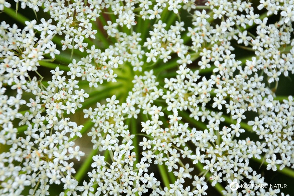 - Blüten: Kleine, weiße bis rosafarbene Blüten in charakteristischen Dolden, meist zwischen Juni und August.
