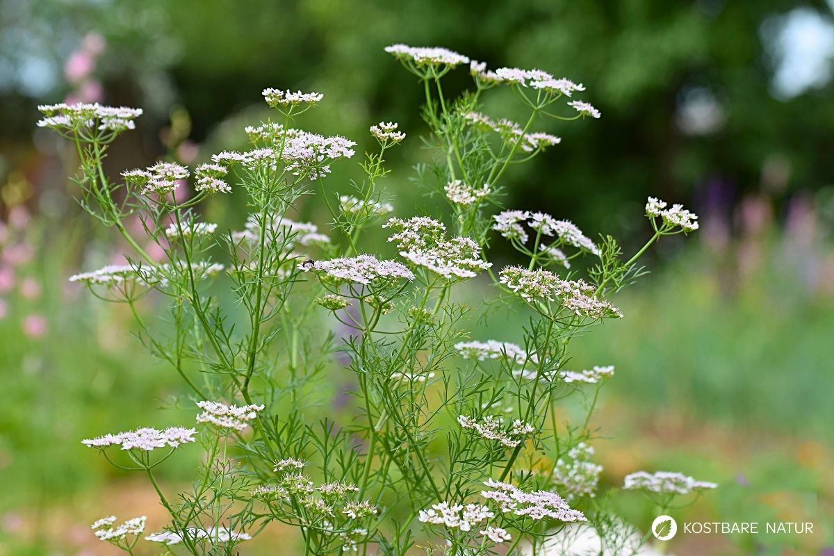 Kümmel ist eine zweijährige, krautige Pflanze aus der Familie der Doldenblütler. Auffällig ist seine filigrane Wuchsform mit fein gefiederten Blättern und zarten weißen bis rosafarbenen Doldenblüten, die im Sommer erscheinen.