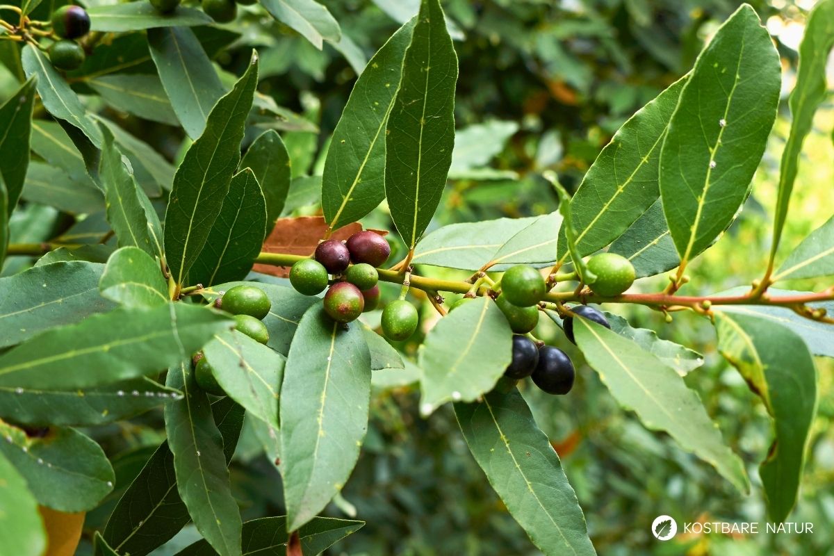 - Echter Lorbeerstrauch, Lorbeerbaum, Edler Lorbeer, Gewürzlorbeer, Wundblatt, Götterstrauch, Nierenblatt, Daphnebusch