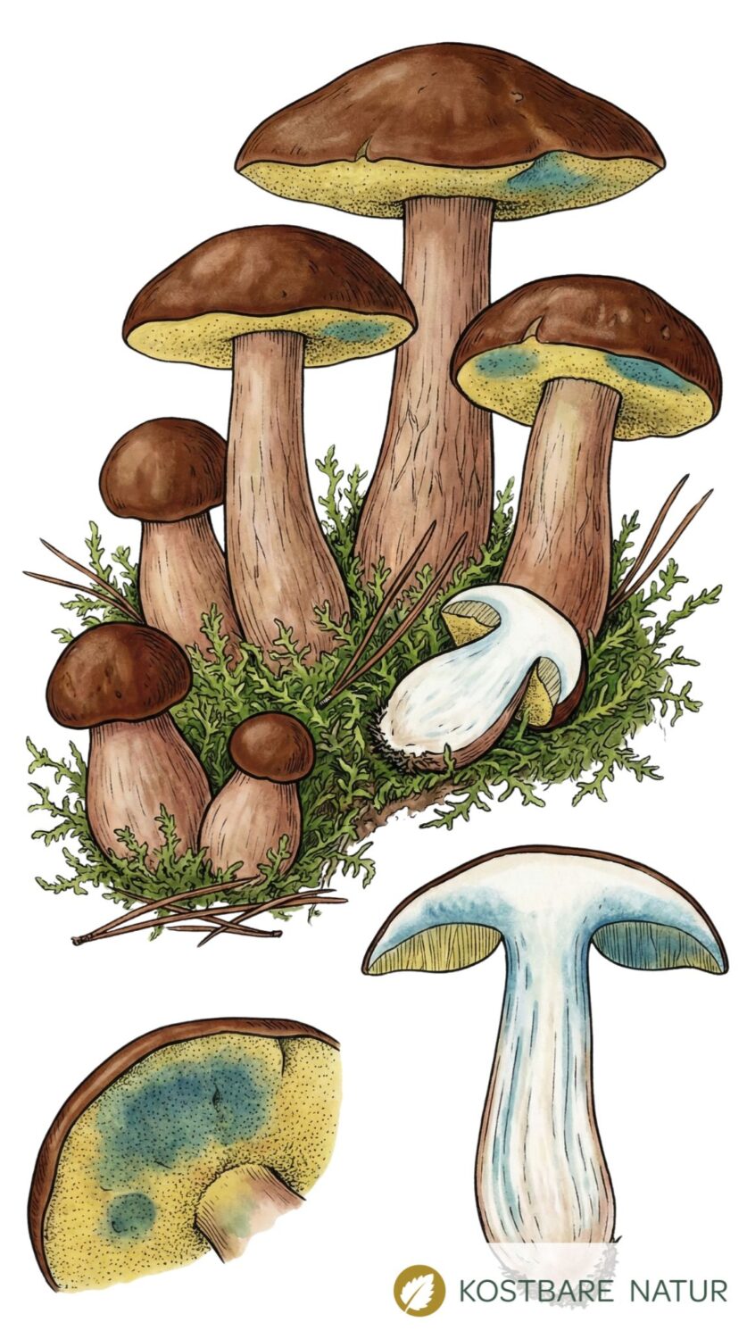 - Bei Anschnitt oder Druck verfärben sich die Röhren deutlich blau und der Stiel bläulich.