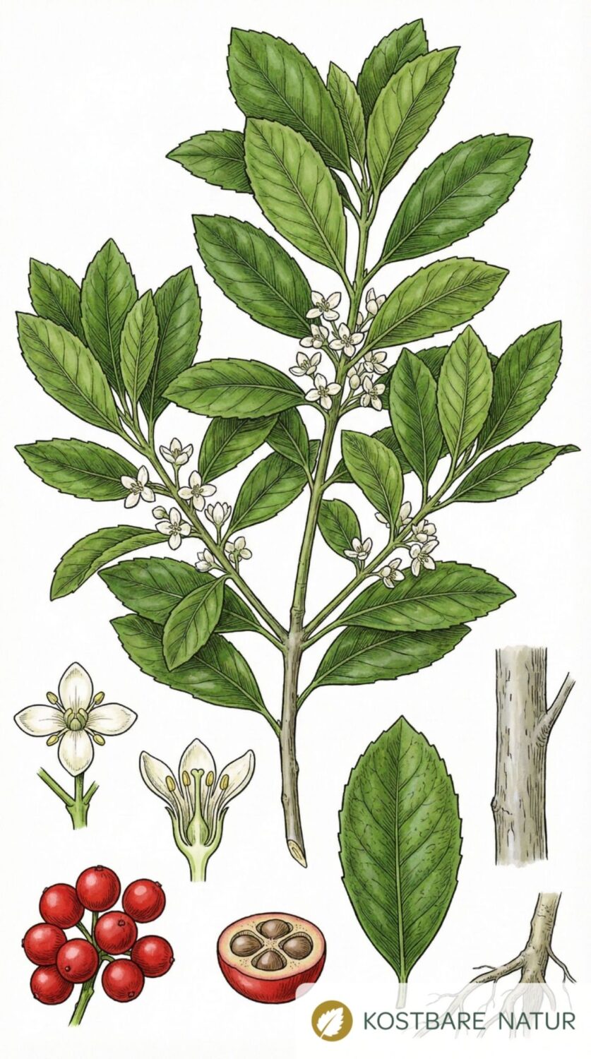 - Immergrüner Strauch/Baum mit dunkelgrünen, ledrigen Blättern; Grundlage des stimulierenden Mate‑Tees