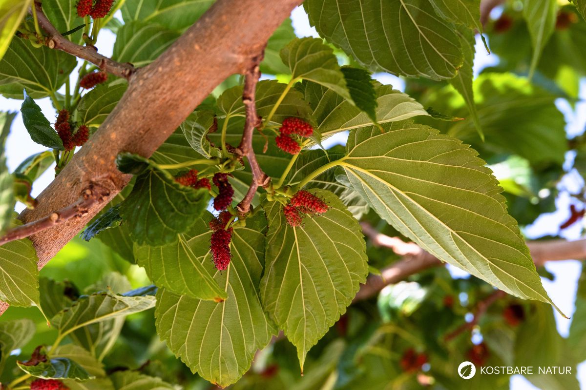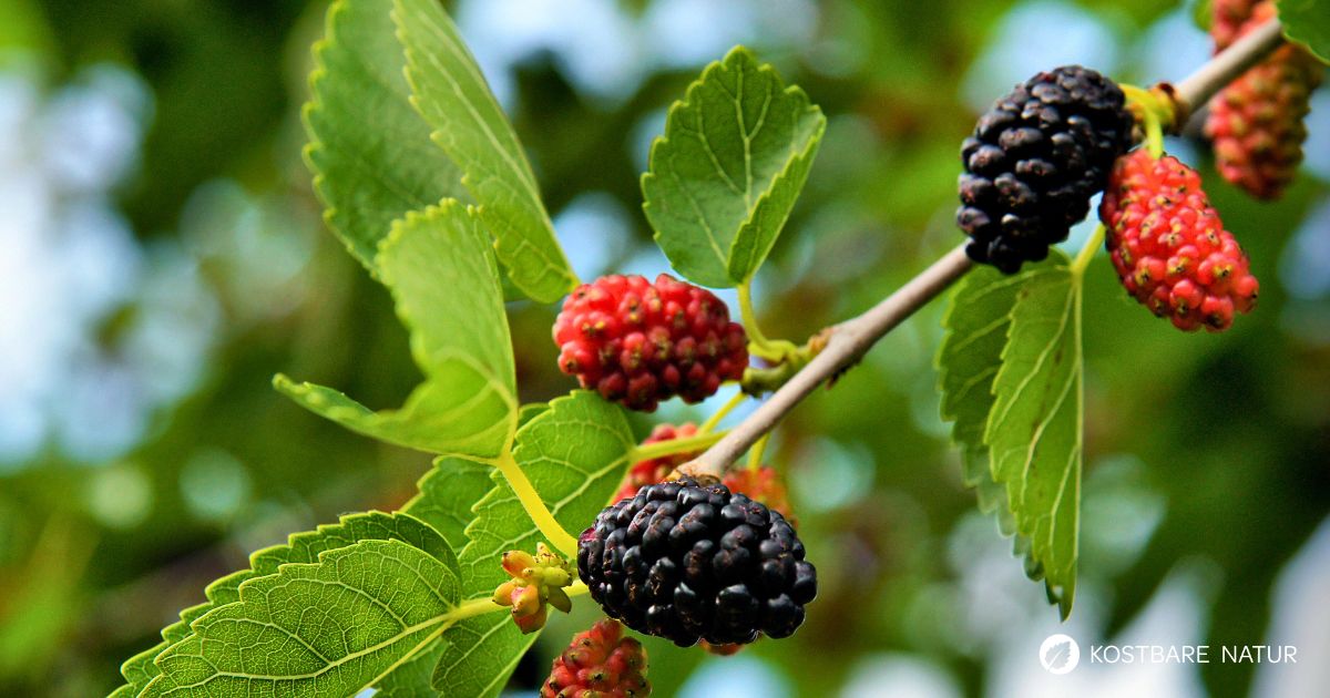 - Die Maulbeere, die als Baum oder Strauch wachsen kann, kommt ursprünglich aus Nordamerika und Asien. Sie ist seit etwa 5000 Jahren bekannt und von ihren weltweit zwölf Arten, haben drei ihren Weg nach Europa gefunden. Die Weiße, die Schwarze und die Rote Maulbeere sind bei uns zu finden, wobei vor allem die weiße Maulbeere für die Seidenraupenzucht zur Herstellung von Seide angebaut wurde. Durch bessere Importwege wurde die Zucht jedoch bald überflüssig. Heute stehen viele Bäume als Relikt aus dieser Zeit an Alleen und Marktplätzen. Die Maulbeere entwickelt brombeerähnliche, süße Früchte, die für den direkten Verzehr oder zur Weiterverarbeitung geeignet sind. Die Früchte enthalten zahlreiche gesunde Inhaltsstoffe. Früchte als auch Blätter können als Heilmittel wie in Asien bei Verstopfung, oder zur Blutzucker- oder Cholesterinspiegelsenkung eingesetzt werden.