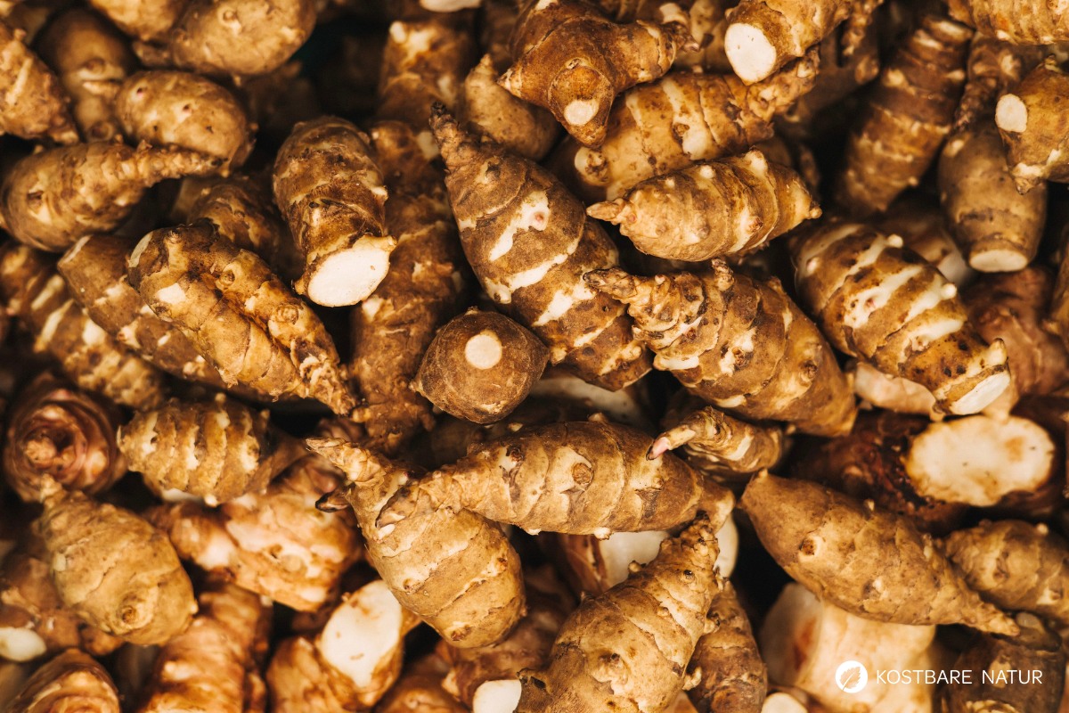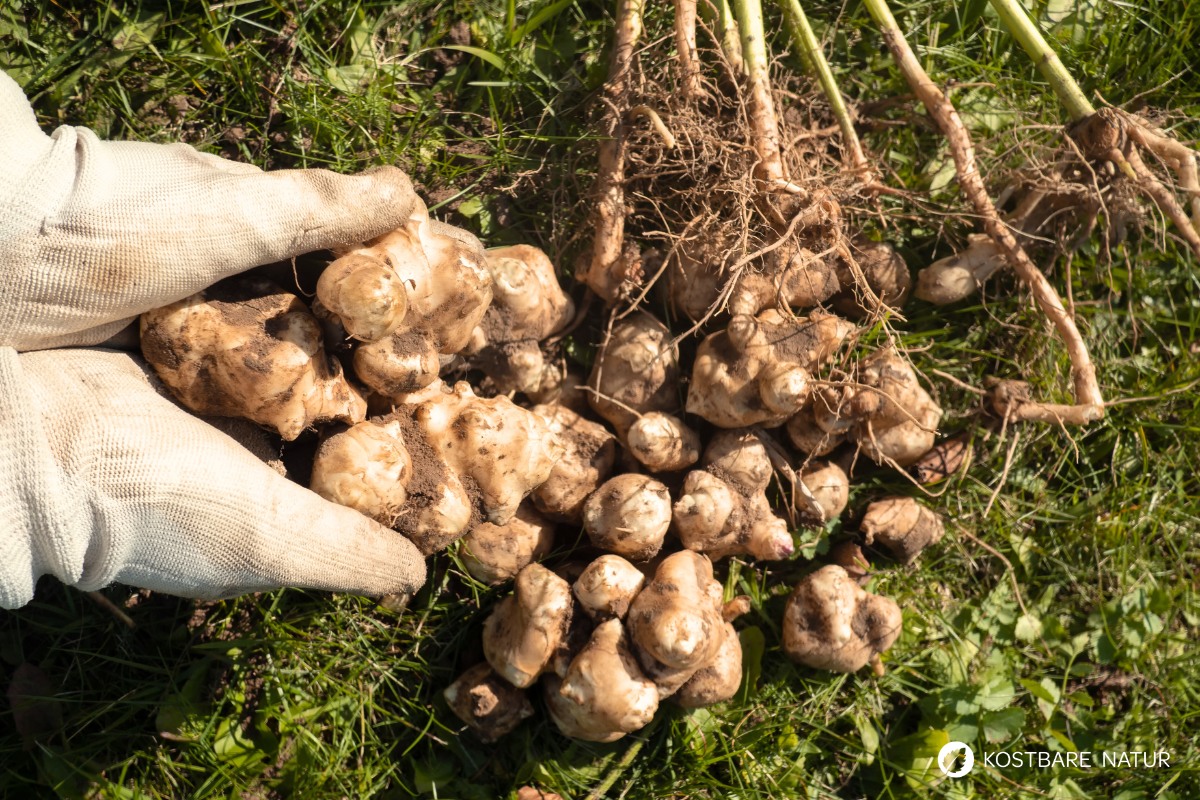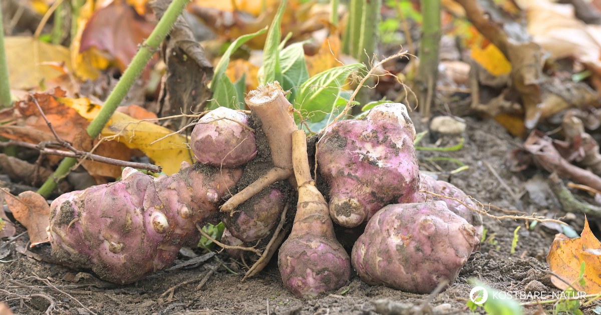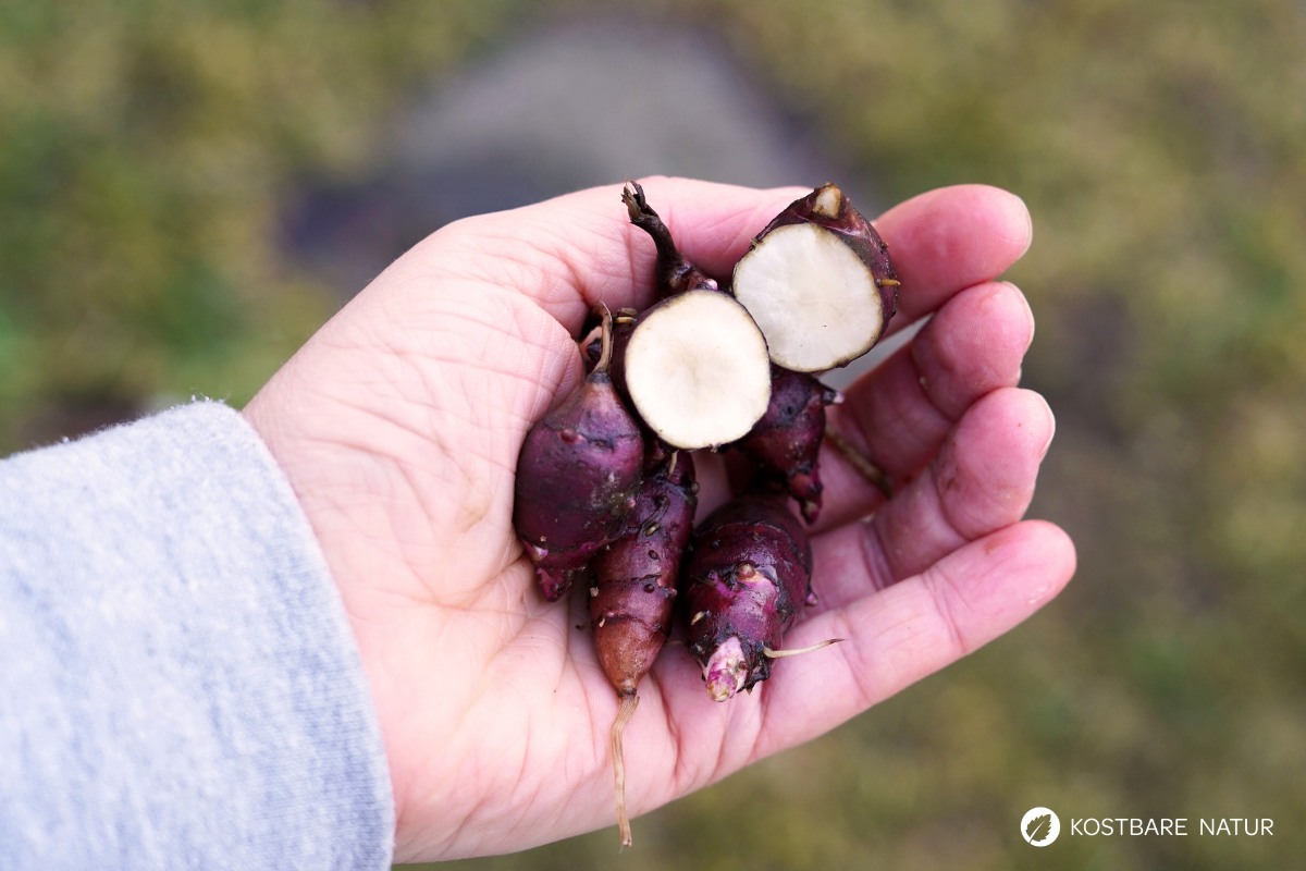 - 4-10 Zentimeter große, mit dünner, hellbrauner bis rosa-lila gefärbter Haut überzogene Knollen