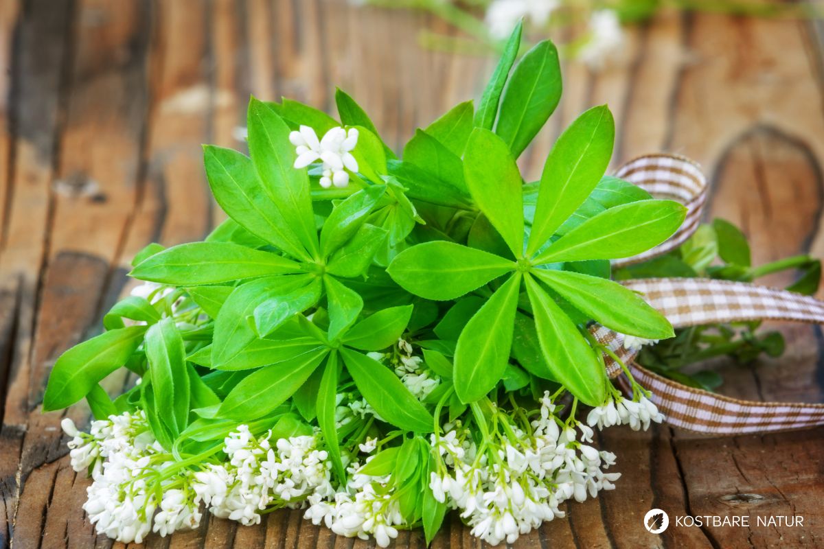 Nutze für einen aromatischen Kräuterwein die Waldmeisterblüten. Dafür einfach für 12 Stunden im Wein einlegen.