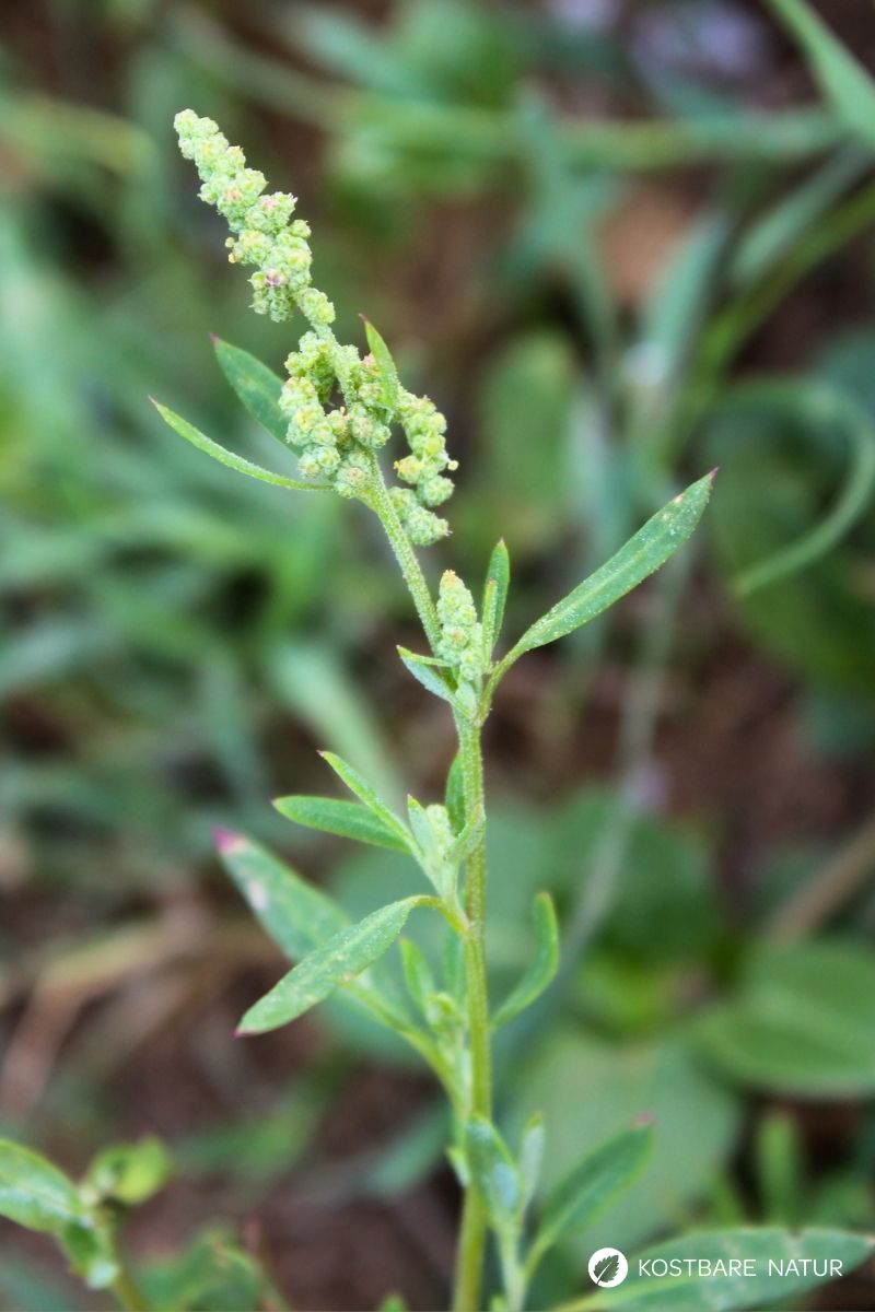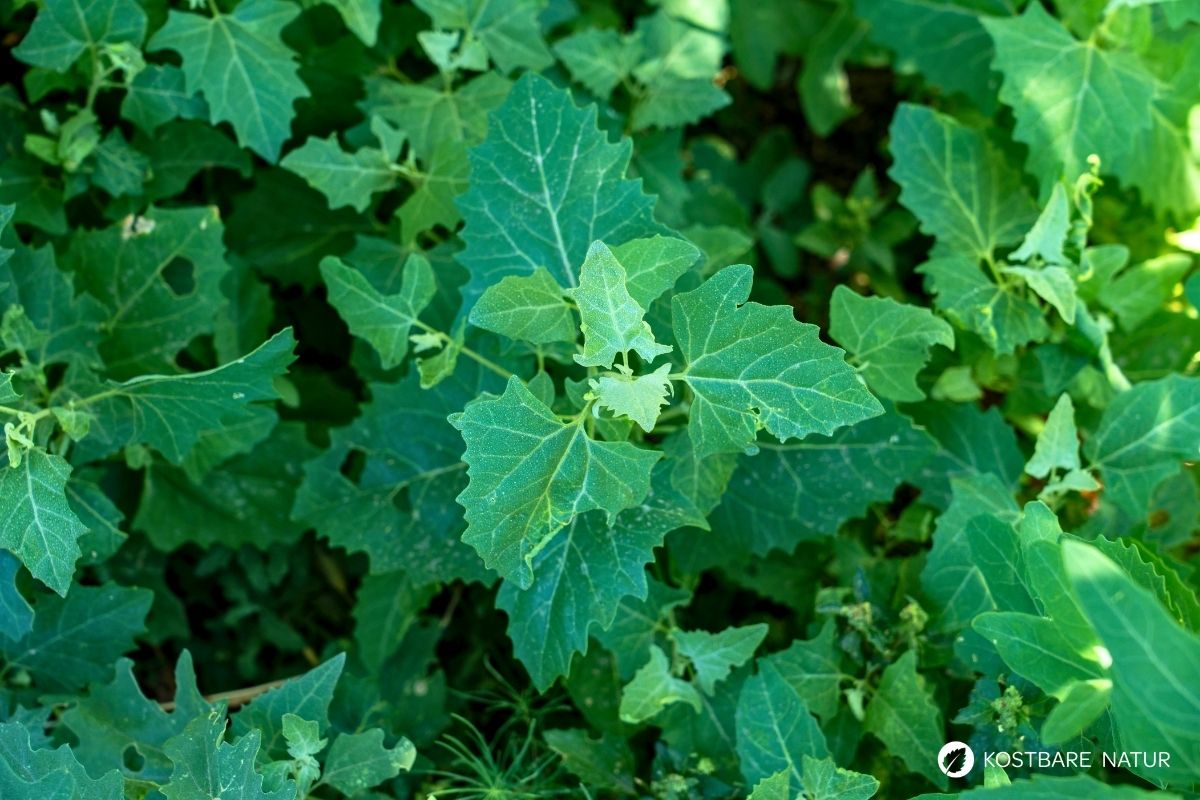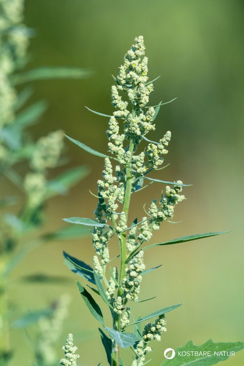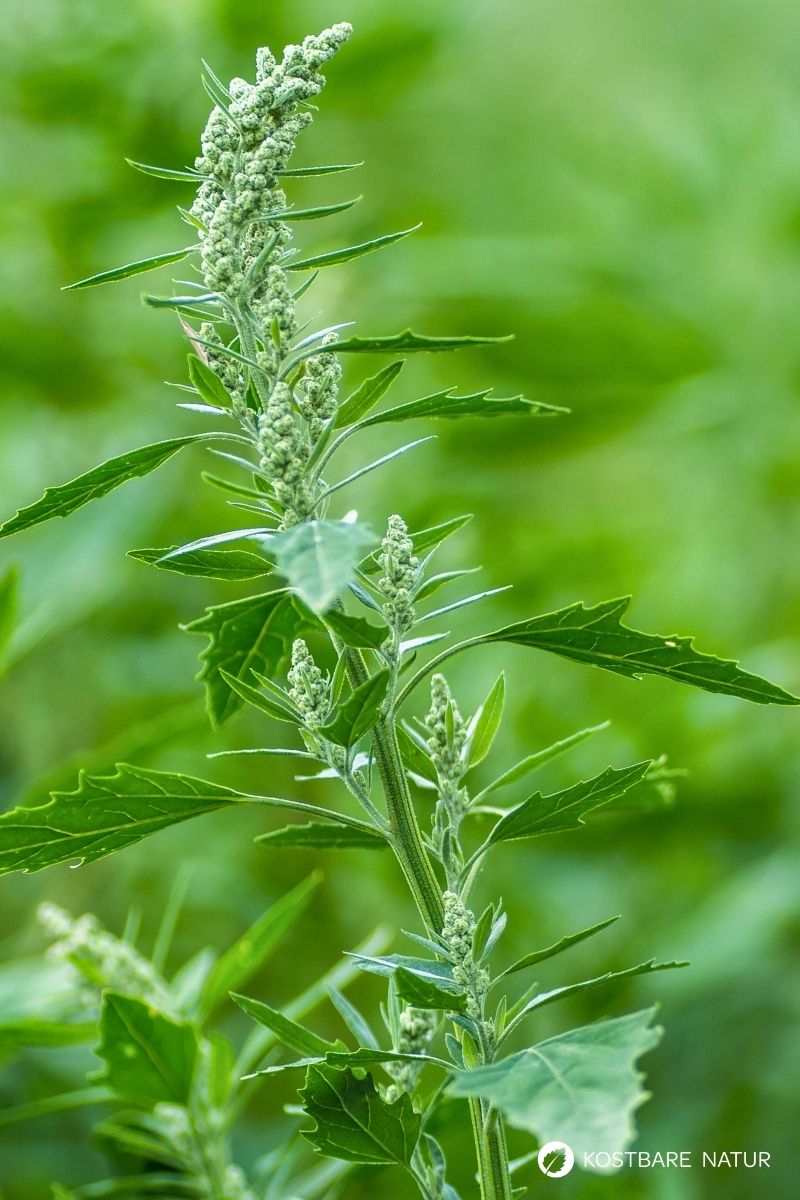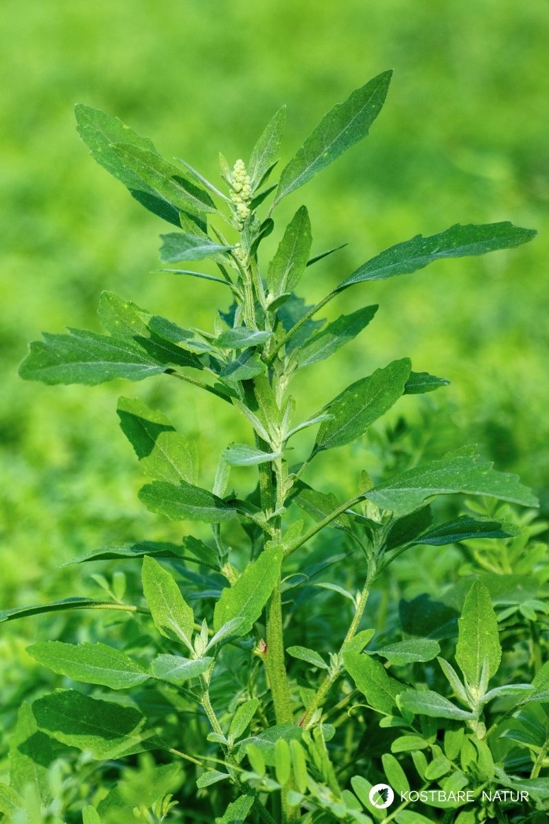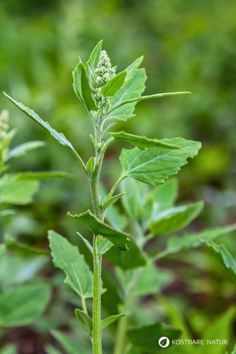 - Ein- bis zweijährige Pflanze mit mehlbestäubten, gänsefußförmigen Blättern und grünlichen Blütenrispen.