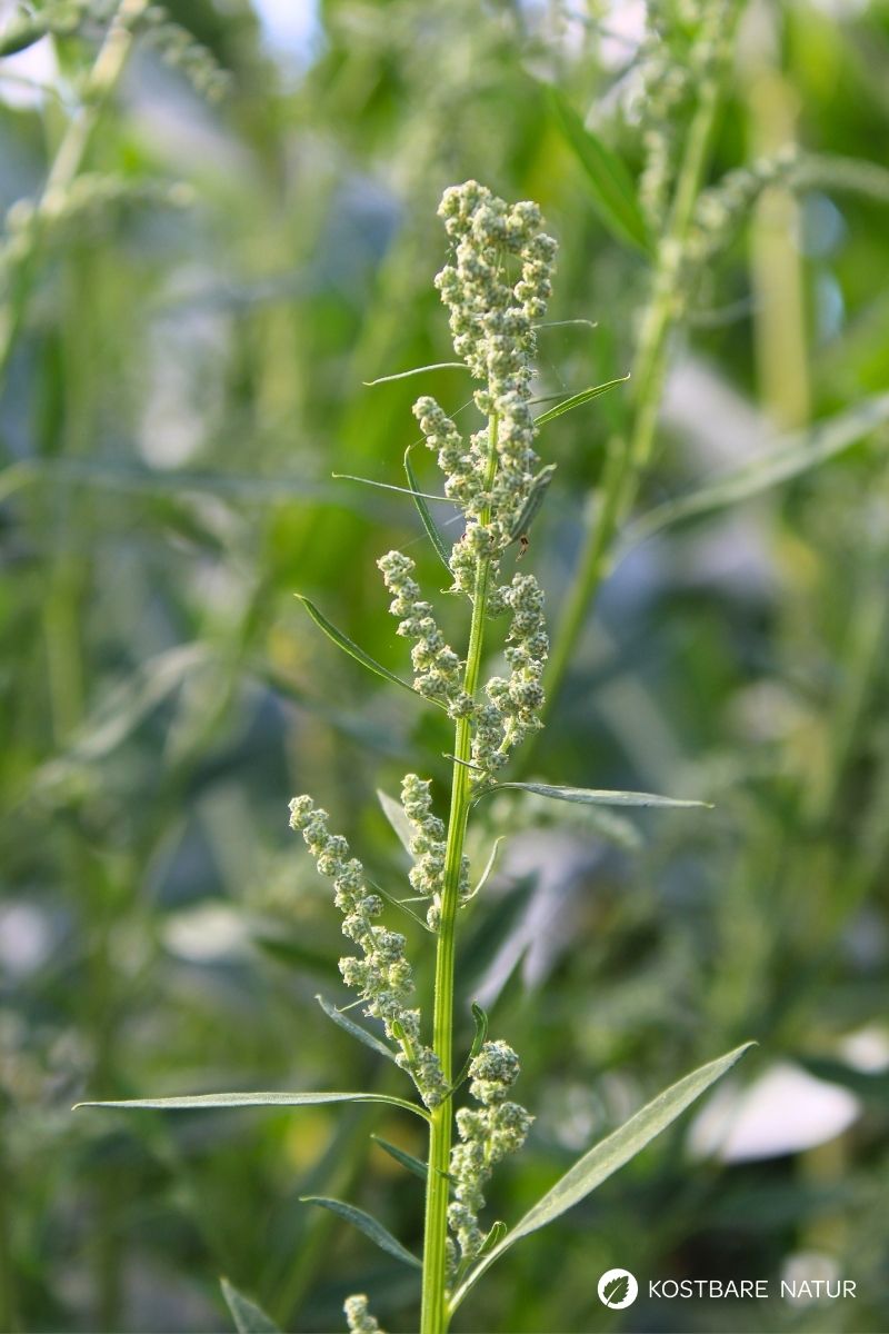 Wenn du auf der Suche nach einer heimischen Alternative zu teurem Superfood bist, dann ist der Weiße Gänsefuß genau dein Kandidat. Du kannst fast die gesamte Pflanze verwenden: Die jungen Triebe und Blätter schmecken mild und erinnern stark an Spinat, haben aber eine leicht nussige Note. Die Blütenstände können wie Brokkoli gedünstet werden, und die schwarzen, glänzenden Samen lassen sich im Herbst sammeln, trocknen und wie Quinoa kochen oder zu Mehl verarbeiten. Sie stecken voller Eiweiß und wichtiger Fettsäuren.