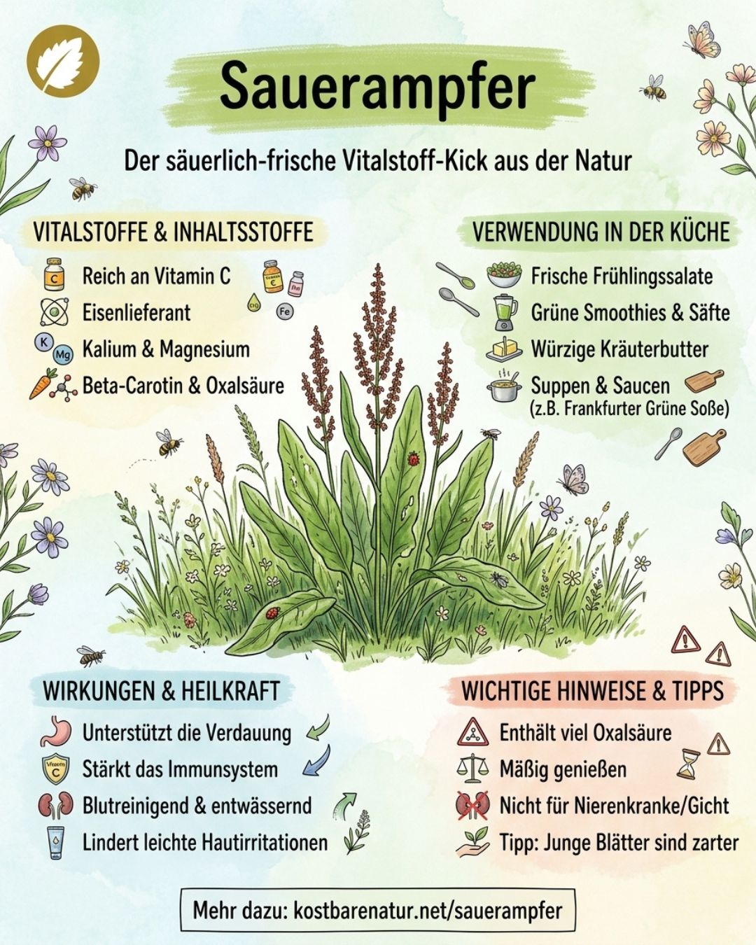 Der Wiesen-Sauerampfer (Rumex acetosa) begleitet den Menschen seit Jahrhunderten als frische Wildpflanze für Küche und Hausapotheke. Vielleicht bist du ihm schon oft begegnet, ohne ihn bewusst wahrzunehmen: auf Wiesen, an Wegrändern oder auf feuchten Weiden. Sein angenehm säuerlicher Geschmack macht ihn zu einer beliebten Zutat in der Frühlingsküche, während seine Inhaltsstoffe traditionell zur Unterstützung der Verdauung und zur sanften Blutreinigung genutzt wurden. Besonders geschätzt wird der Wiesen-Sauerampfer für seine erfrischende, anregende Wirkung, die den Stoffwechsel in Schwung bringt und nach dem Winter neue Energie schenkt. Gleichzeitig wirkt er leicht zusammenziehend und entzündungshemmend, was ihn innerlich wie äußerlich interessant macht.