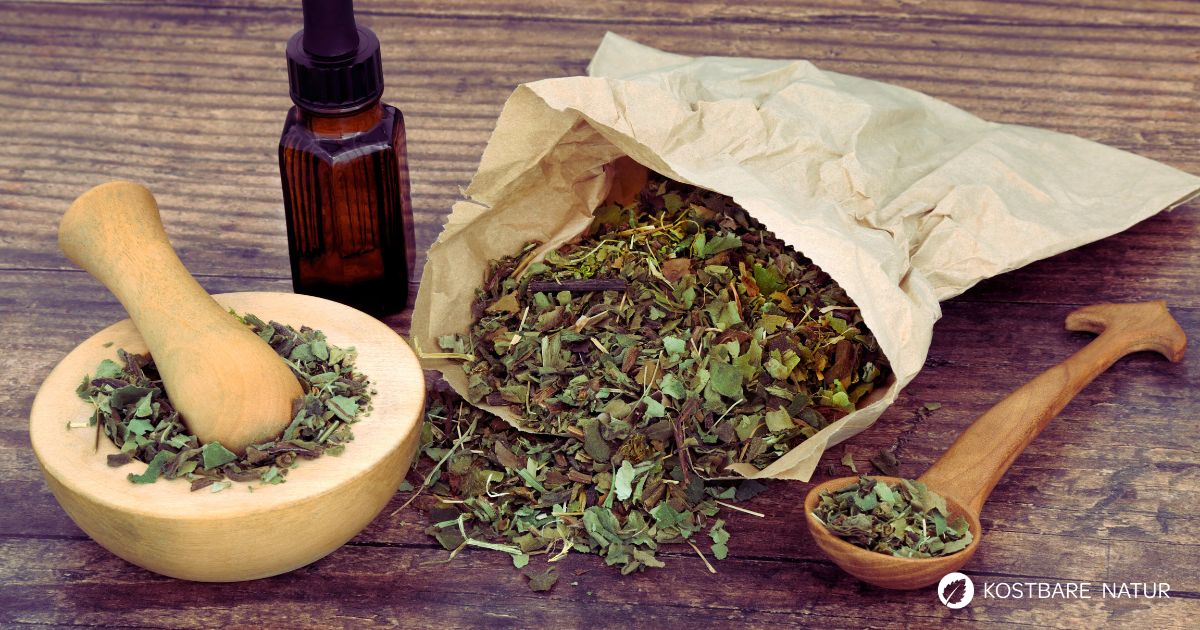 Wildpflanzen an einem trockenen Tag sammeln und vollständig trocknen, um Schimmelbildung zu vermeiden, zum Beispiel auf einem Kräutertrockner. Alternativ getrocknete Kräuter verwenden.