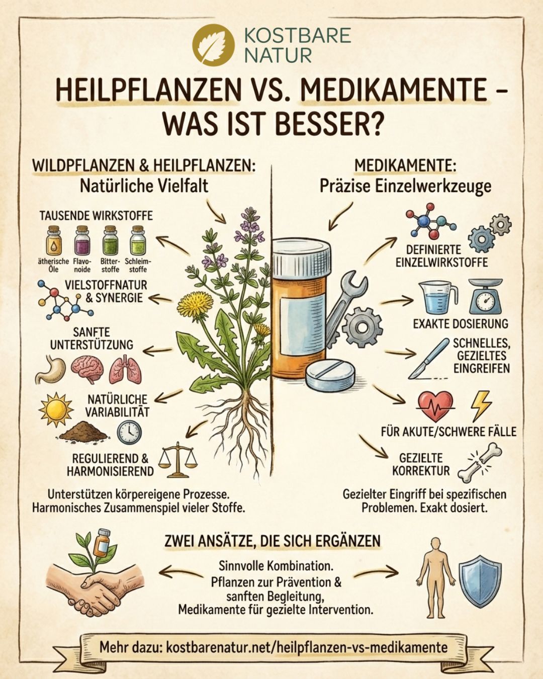Wild- und Heilpflanzen sind also nicht „schwächere Medikamente“. Sie sind eigene therapeutische Werkzeuge, die nach anderen Regeln funktionieren – und viele Beschwerden auf natürliche Weise lindern können. Ihre Vielschichtigkeit ist kein Nachteil, sondern ein Ausdruck biologischer Intelligenz.