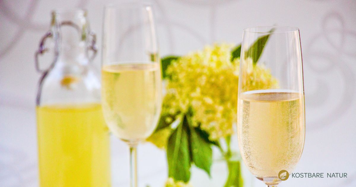 Für den köstlichen Sekt benötigst du nur wenige Zutaten und etwas Geduld. Die weißen Blütendolden beginnen im Mai zu blühen. Ernte sie am besten kurz nachdem sie vollständig erblüht sind und transportiere sie in einem luftdurchlässigen Beutel oder Körbchen nach Hause. Breite sie im Schatten auf einem Tuch aus und gib Insekten und Krabbeltierchen etwas Zeit das Weite zu suchen.