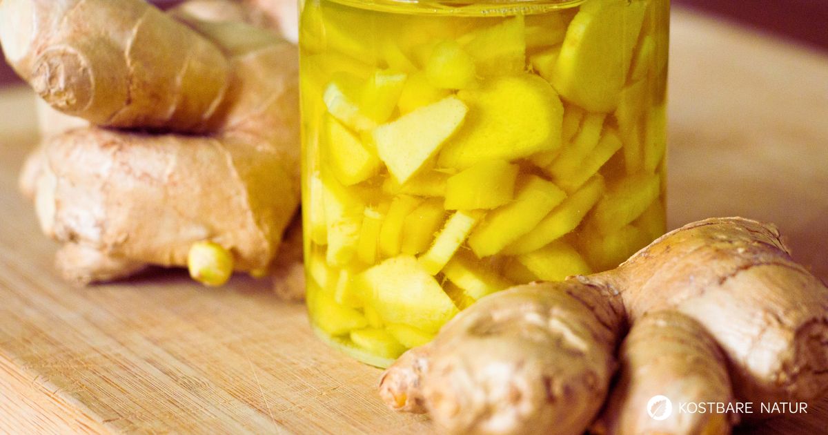 Aus Erfahrung tut Ingwer bei Erkältung gut. Dazu nimmst du ein bis zwei Teelöffel der Ingwer-Tinktur in Tee oder Wasser ein. Alternativ kannst du dir auch einen Tee aus Ingwerwurzeln zubereiten.