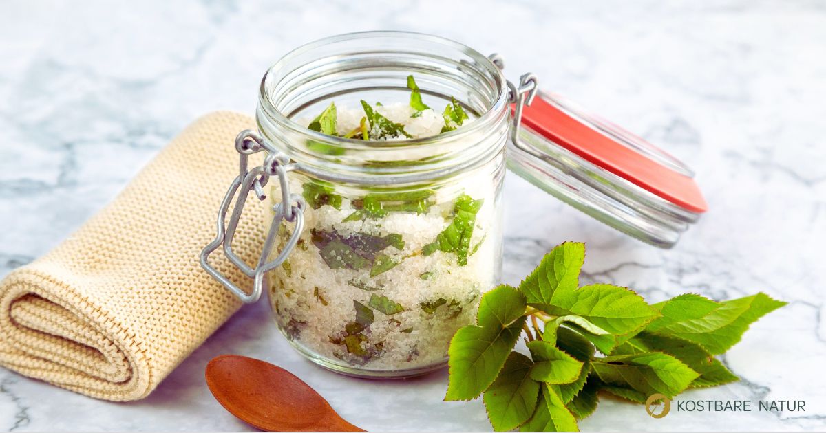 In einer Schale Totes-Meer-Salz, Giersch und die Ölmischung miteinander vermengen.