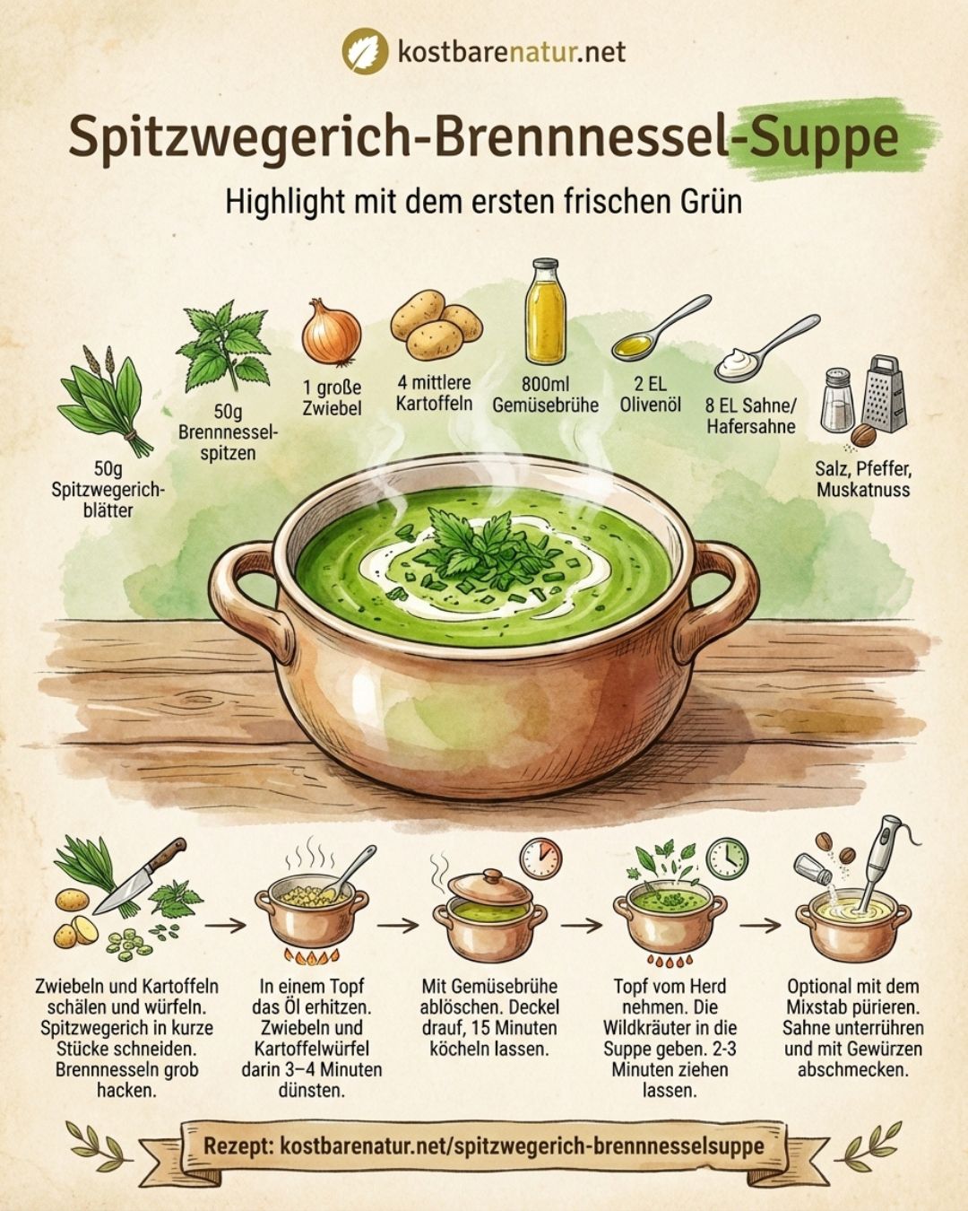 So einfach sind leckere und gesunde Spitzwegerich-Brennnesselsuppen zubereitet.