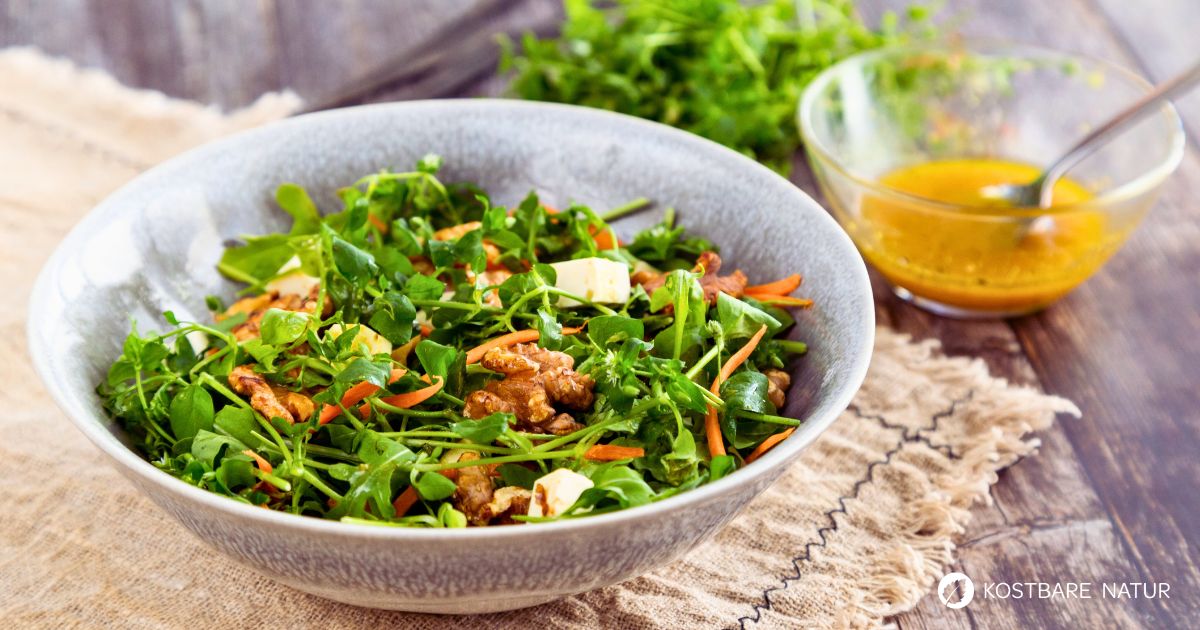 kcalDieser Vogelmiere Salat mit kandierten Walnüssen verbindet frisches Wildgrün mit süßem Crunch und salzigem Feta. Die Vogelmiere liefert wertvolles Vitamin C und bringt eine mild nussige Note mit. Ein schneller Rohkostsalat, der satt macht und trotzdem leicht bleibt.